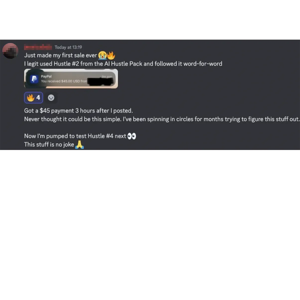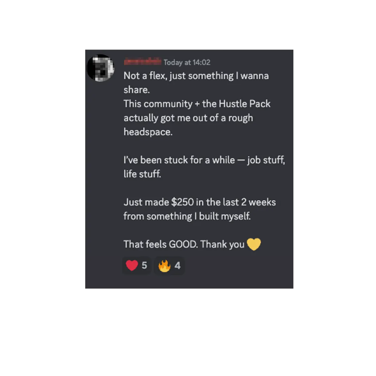 "I spend hours scrolling TikTok seeing people flex their e-com stores and "agencies," and it all feels so fake and impossible. I bought this pack because it was cheap and I was bored. I tried the Viral Clipper hustle, and it's actually... fun? I made my first $50 making a clip for a small streamer. It's not a Lambo, but it paid for my weekend plans. Low-key genius."
